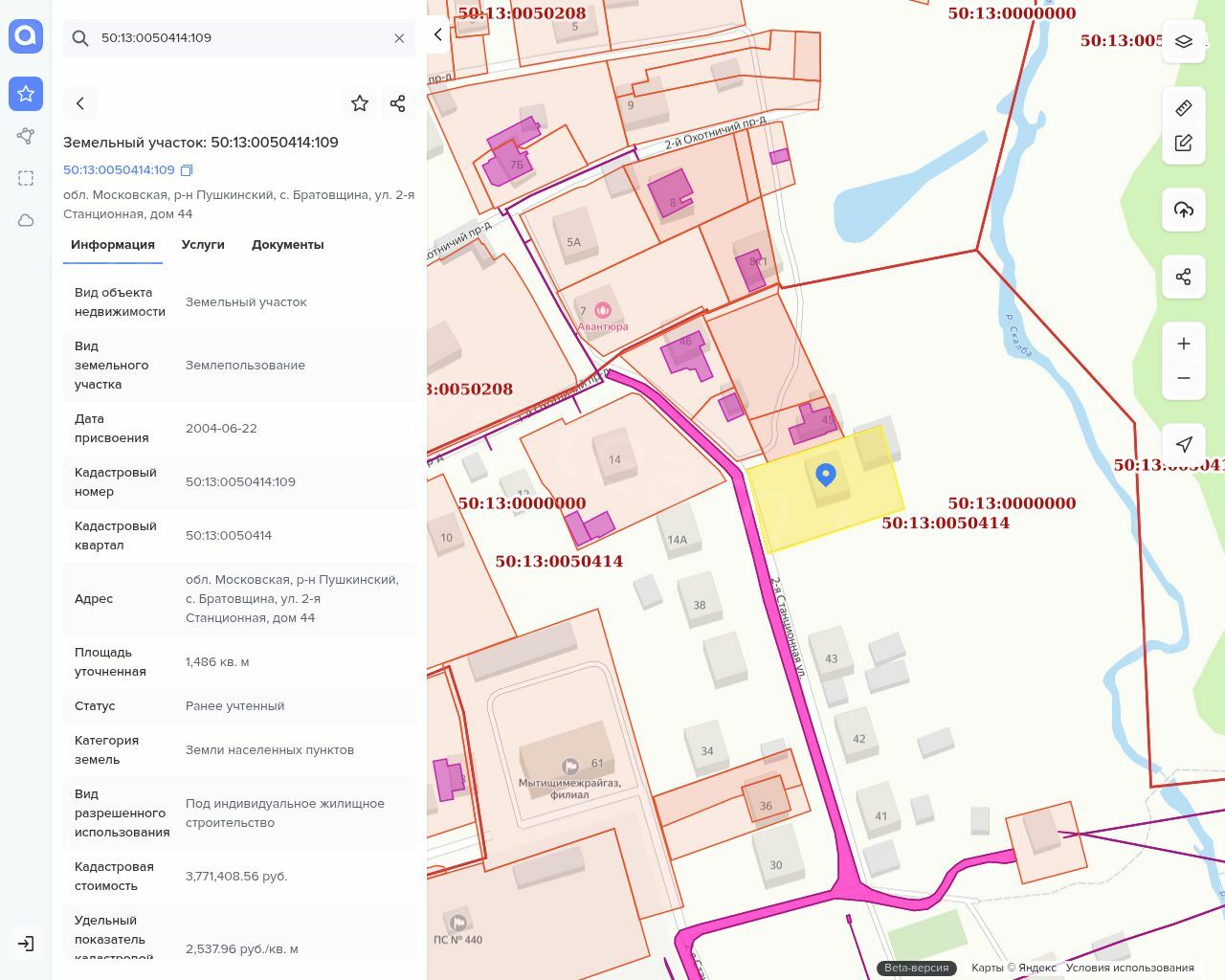 Земельный участок площадью 1486 кв.м (К.Н. 50:13:0050414:109). Виды разрешенного использования: под индивидуальное жилищное строительство. Адрес: Местоположение установлено относительно ориентира, расположенного в границах участка. Почтовый адрес ориентира: обл. Московская, р-н Пушкинский, с. Братовщина, ул. 2-я Станционная, дом 44.
