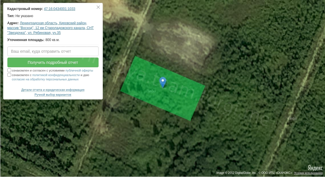 Земельный участок, площадь: 800 кв.м., категория земель: Земли сельскохозяйственного назначения, разрешенное использование: для садоводства, кадастровый номер: 47:16:0434001:1033