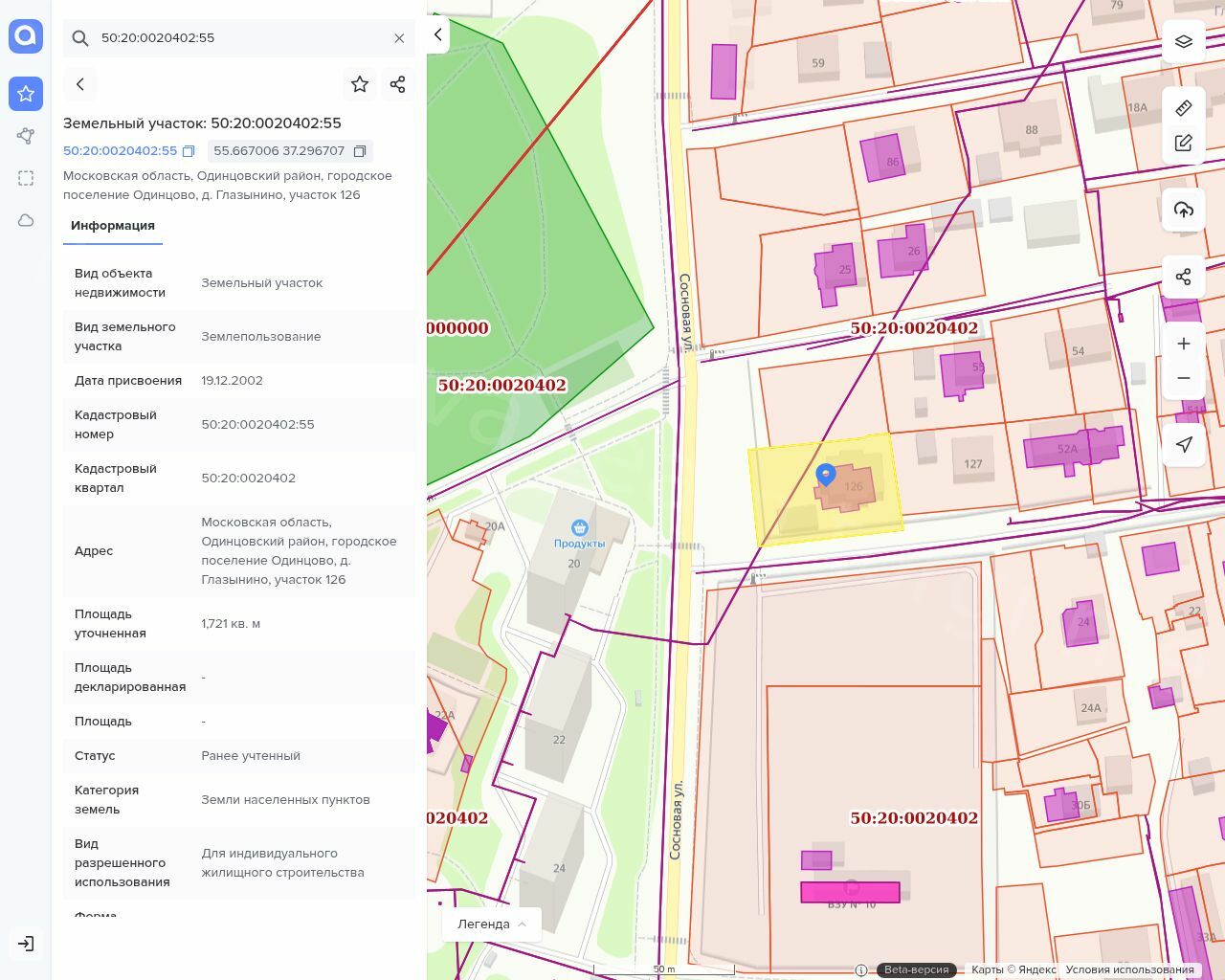 Земельный участок, кадастровый номер 50:20:0020402:55, площадь 1721 кв.м. Адрес: Московская область, Одинцовский район, городское поселение Одинцово,д. Глазынино, участок 126