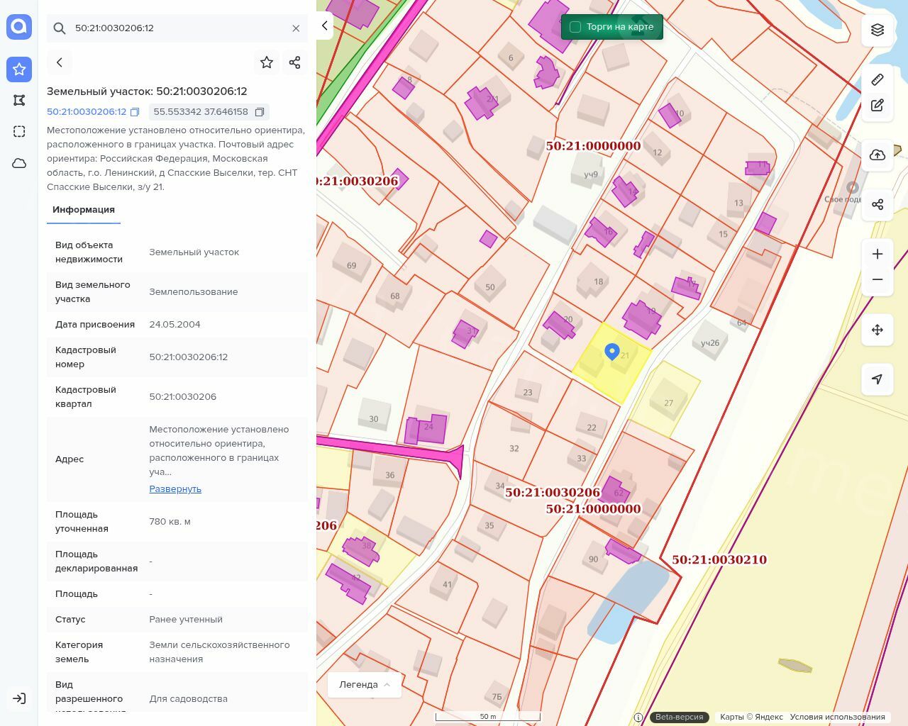 Земельный участок, кадастровый номер 50:21:0030206:12, площадь 780,00 кв.м. Адрес: Местоположение установлено относительно ориентира, расположенного в границах участка. Почтовый адрес ориентира: обл. Московская, р-н Ленинский, с/о Булатниковский, с/т "Спасские выселки", уч.№21.