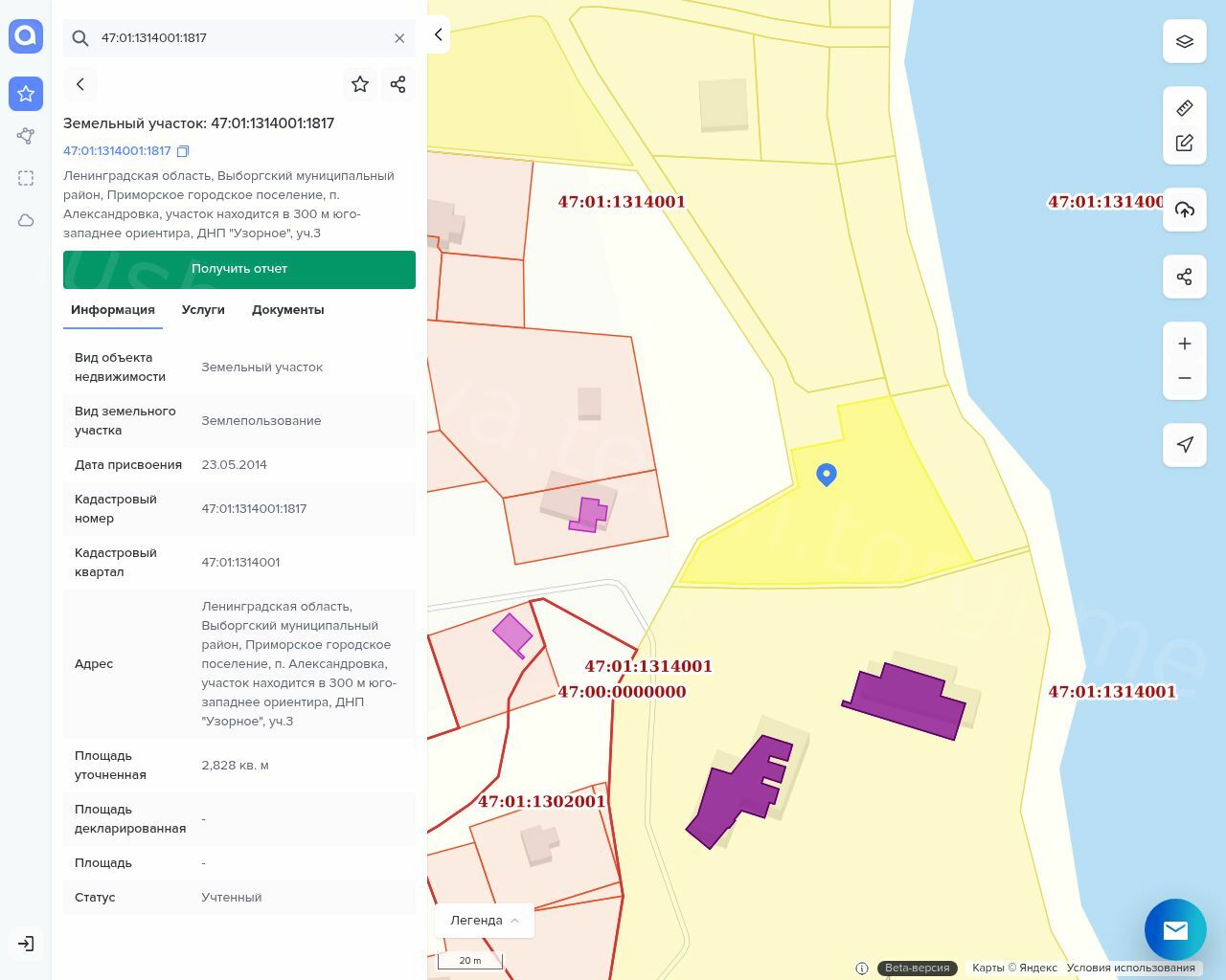 Земли сельскохозяйственного назначения для ведения дачного хозяйства: Земельный участок, площадь 1070 кв. м, кад. №47:01:1314001:1816, Земельный участок, площадь 2828 кв. м, кад.№47:01:1314001:1817.