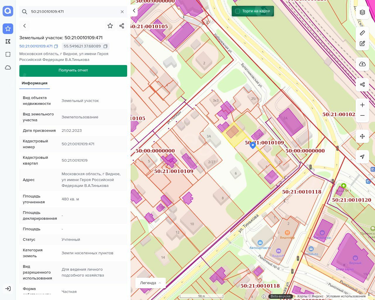 Земельный участок, площадью 480 +/- 8 кв. м, категория земель: Земли населенных пунктов, разрешенное использование: Для ведения личного подсобного хозяйства, с кадастровым номером: 50:21:0010109:471. Адрес: 142702, Российская Федерация Московская область, г Видное, ул. имени Героя Российской Федерации В.А.Тинькова